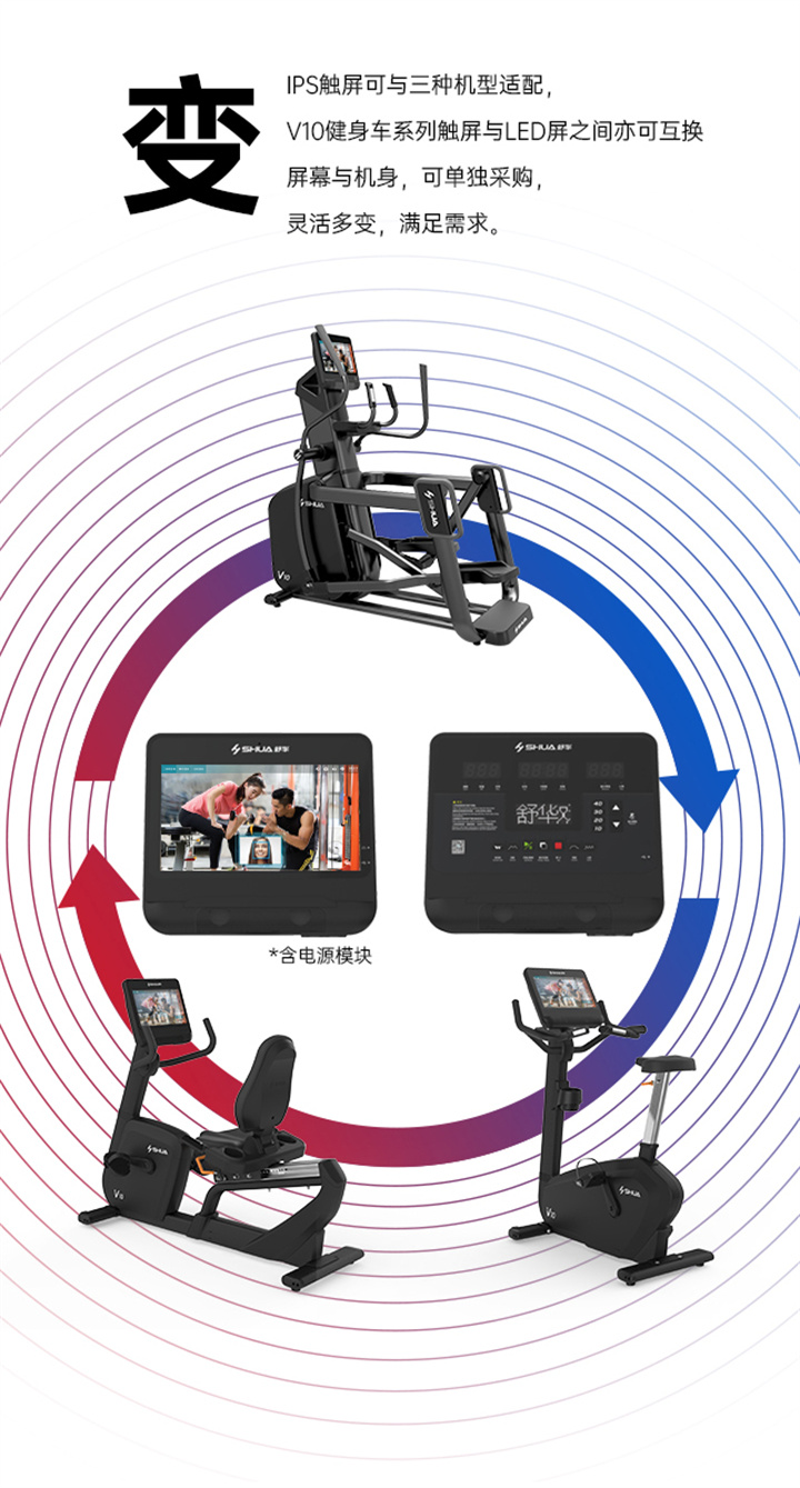 • 产品简介:舒华立式商用健身车SH-B9100U(V10)触屏版拥有超大显示和操作屏幕, 可以任意设置阻力、时间和距离等参数,还可以即时显示心跳和转速等数据,同时,SH-B9100U提供多项科学运动处方,更轻松掌握运动节奏。