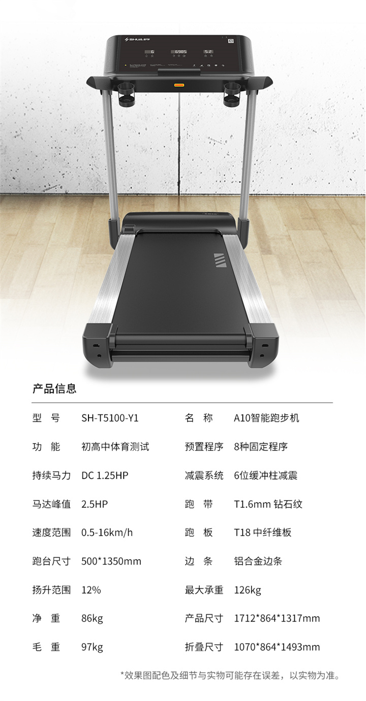 舒华家用跑步机SH-T5100持续马力达1.25HP,具有500×1350mm的跑台,运用无线心率接收模块监测心率,运用6位硅胶减震设计,最大承重是126kg,可以满足大多数家庭的使用。