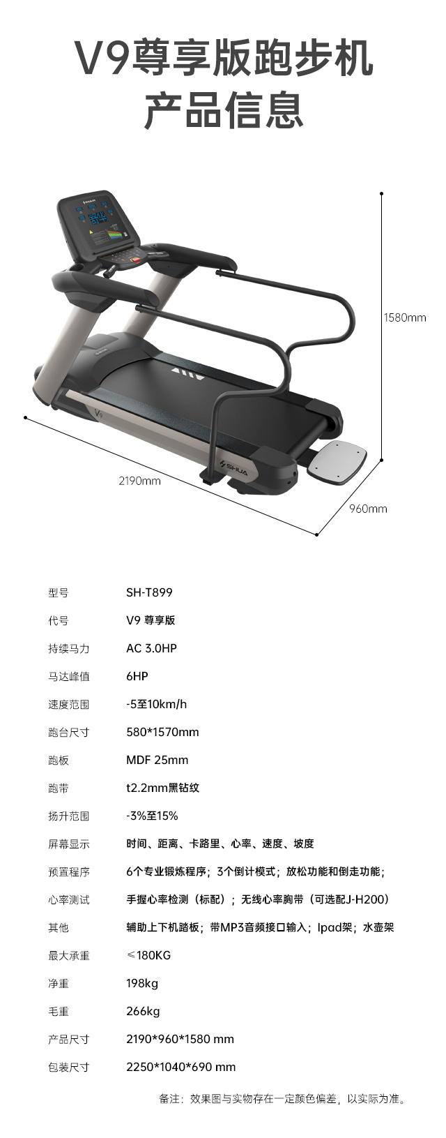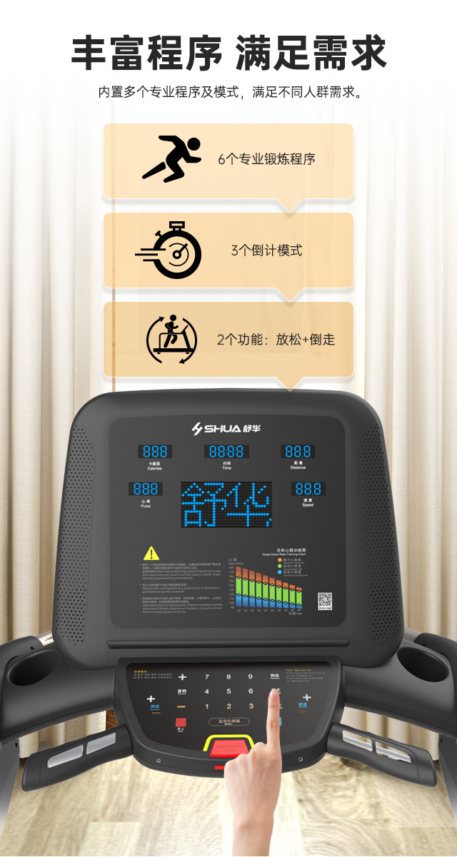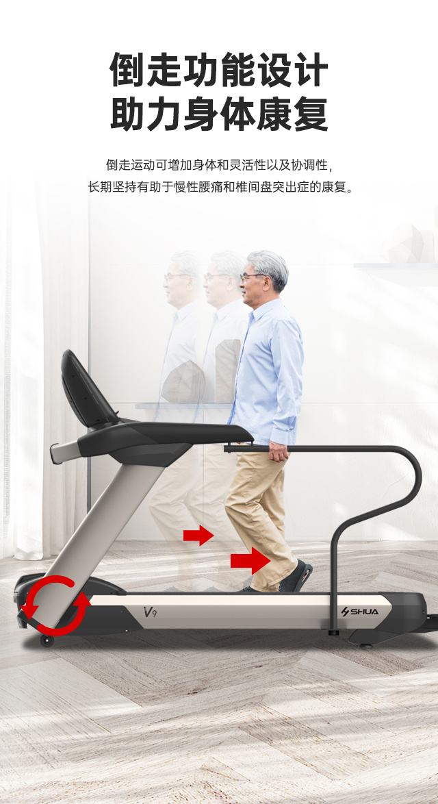 • 产品简介:舒华V9尊享版跑步机SH-T899设有辅助上下机踏板的驱动踏板,控制速度在-5至10km/h内可调,坡度也可在-3至15%内可调,跑台尺寸是580×1570mm,持续马力是AC 3.0HP。